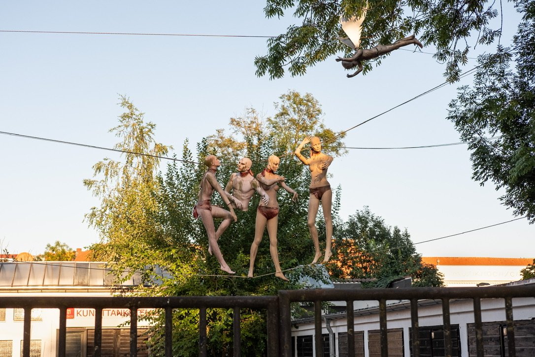 Diese Kunstinstallation verwandelt das Gewohnte in etwas Ungewohntes: Schaufensterpuppen, normalerweise statisch, schweben hier scheinbar schwerelos, miteinander interagierend und doch entrückt. Ihre Posen wirken lebendig, doch ihre Leere bleibt unübersehbar.