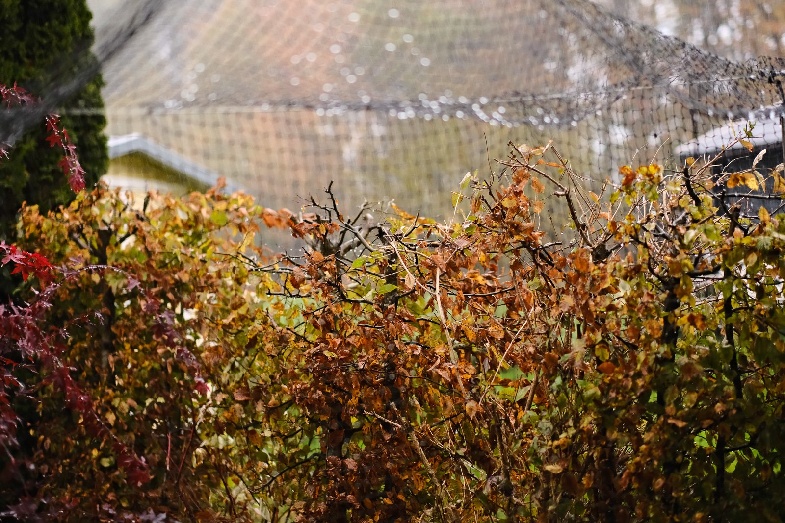 Der Blick auf die Hecke im Garten lässt den regennassen Tag erahnen.